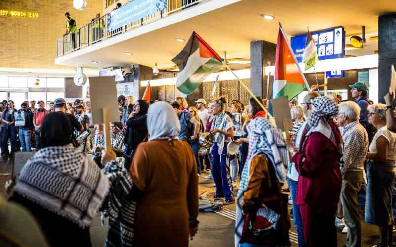 Demonstrators gather to protest against the ongoing food shortages in the Gaza Strip at the Eindhoven Central Station in Eindhoven on July 24, 2025. [AFP]