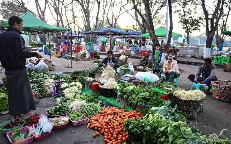 A vendor sells vegetables to a customer at a market in Naypyidaw on December 29, 2025, a day after the first phase of Myanmar's general election. [AFP]