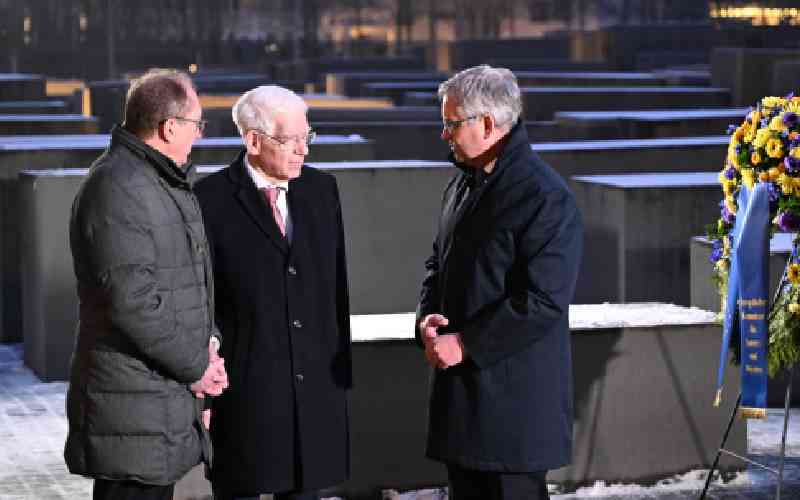 From left: German Interior Minister Alexander Dobrindt, Josef Schuster, President of the Central Council of Jews in Germany and EU Commissioner for Internal Affairs and Migration Magnus Brunner at the holocaust Memorial in Berlin, on January 27, 2026. [AFP]